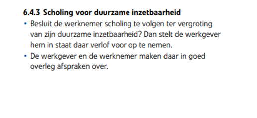 - Scholing die voortzetting van de arbeidsovereenkomst mogelijk maakt in het geval de functie van de werknemer vervalt. Dit is geregeld in art. 7:669, lid 1, BW. De werkgever dient de werknemer in staat te stellen zich door scholing binnen een redelijke termijn te kunnen kwalificeren voor een andere passende functie als zijn functie vervalt.